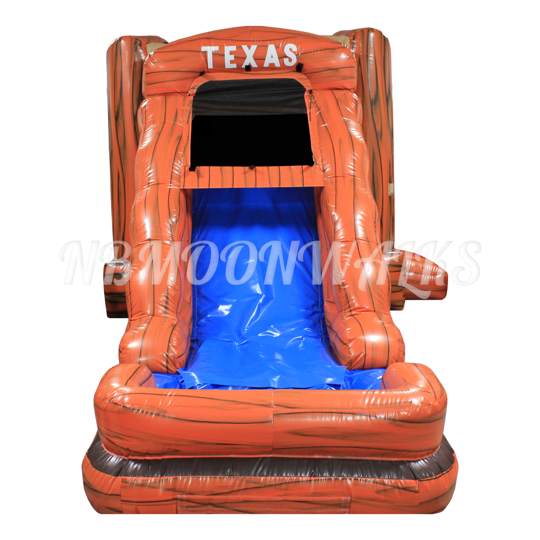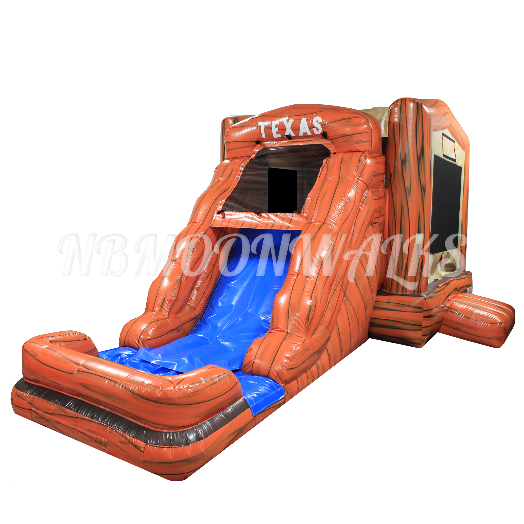 Entering the Orange Marble Combo, you will find a clear bouncing area with one hoop inside. The roof has a velcro exit for emergencies. Off to the side, steps lead up to a single-lane slide. Handles are added along the sides for an easy climb up. Riders will slide down the Orange Marble Combo slide into an inflated pool. The inflated pool ensures that riders may safely slide down, whether the pool is being used with or without water. The pool has drains and flaps to remove water after use.