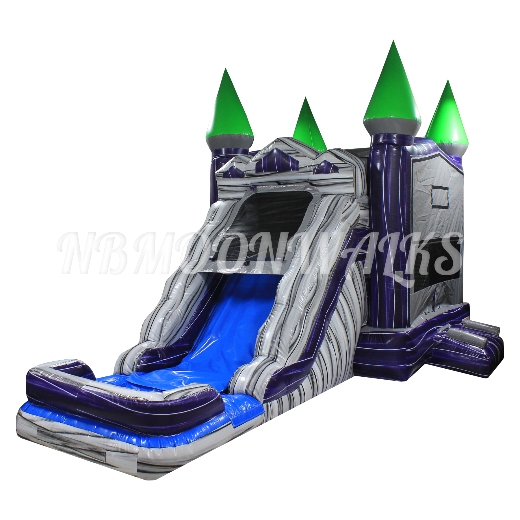Entering the Purple Castle Combo, you will find a clear bouncing area with one hoop inside. The roof has a velcro exit for emergencies. Off to the side, steps lead up to a single-lane slide. Handles are added along the sides for an easy climb up. Riders will slide down the Purple Castle Combo slide into an inflated pool. The inflated pool ensures that riders may safely slide down, whether the pool is being used with or without water. The pool has drains and flaps to remove water after use.